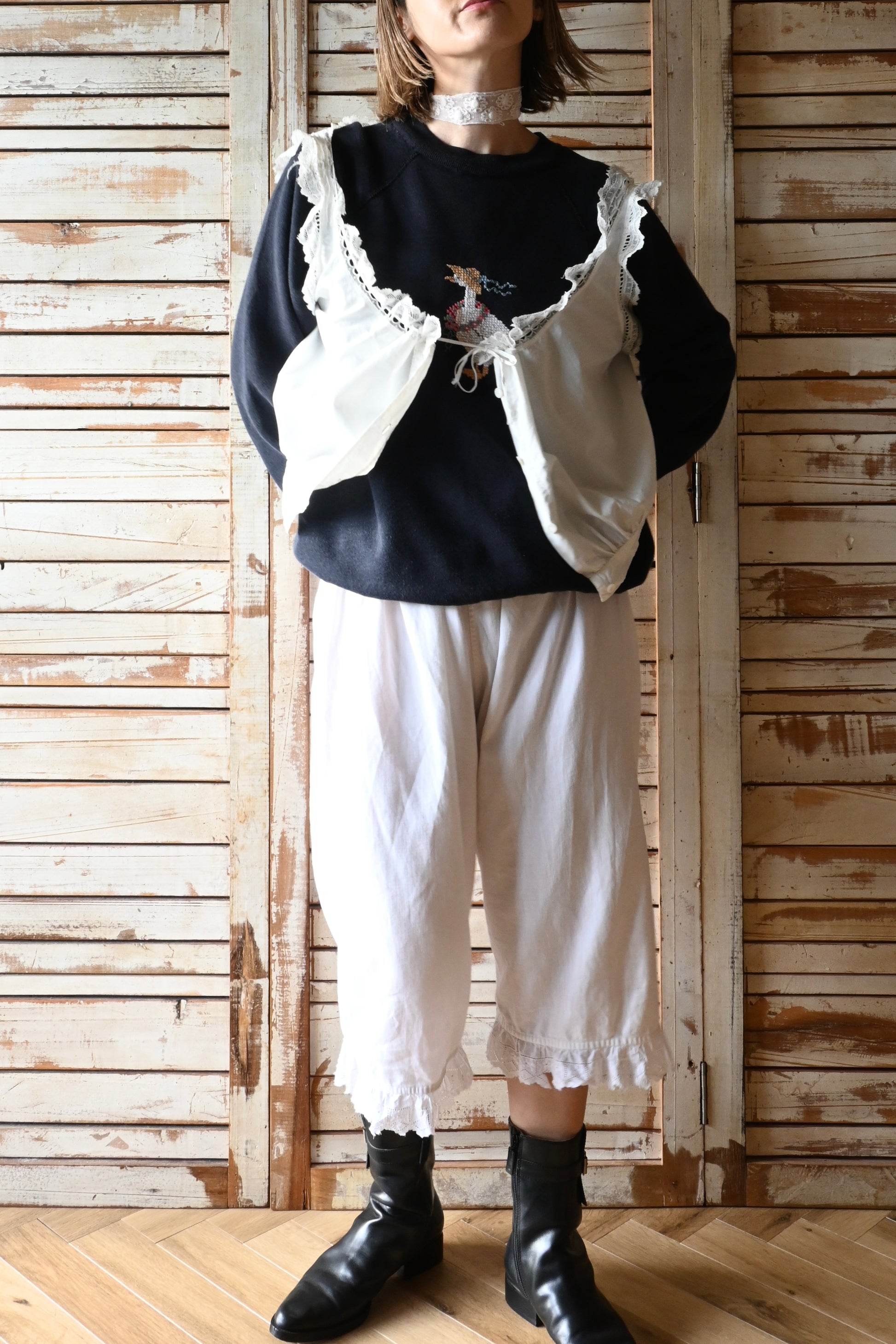 可愛いらしいアヒルがクロスステッチで施されたスウェットシャツ。くたっとした黒地の生地に可愛いデザインがとても魅力的。薄手で柔らかく着心地も軽やかです。