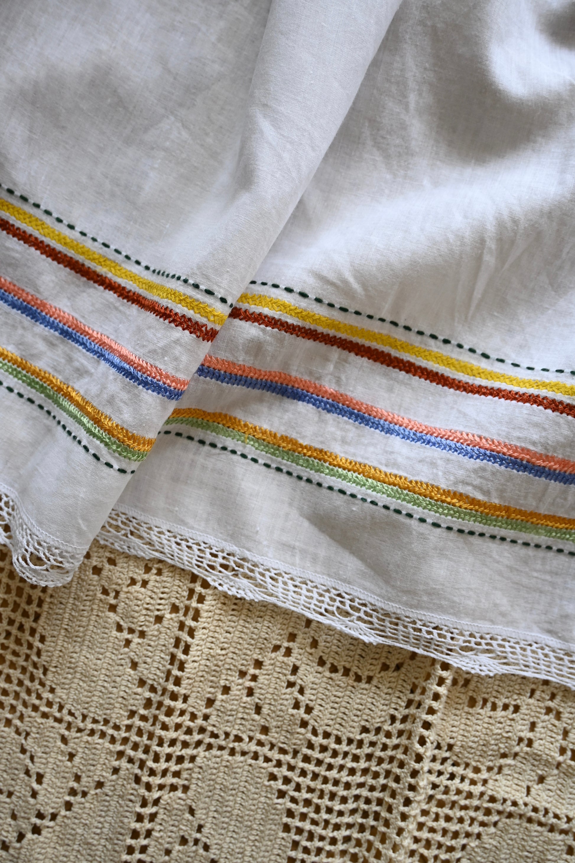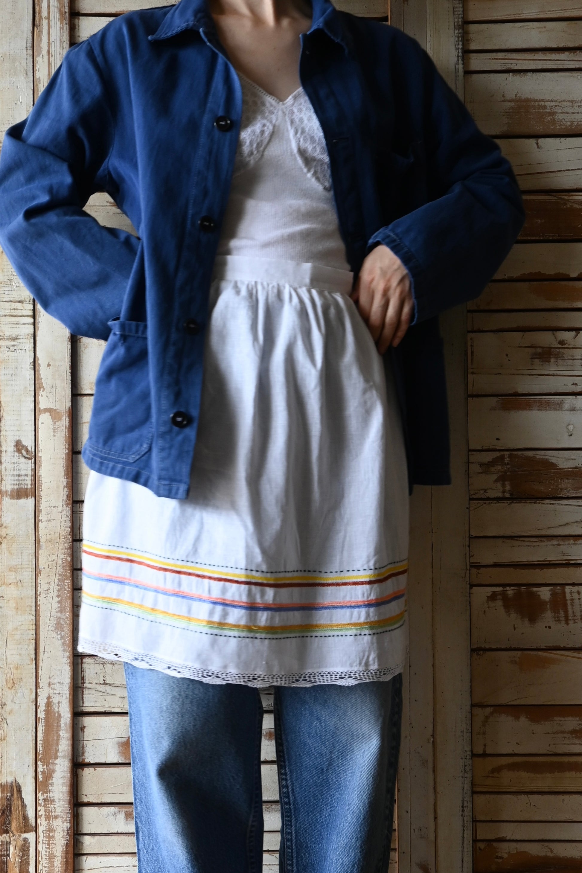 春らしい配色の刺繍が魅力的なコットンエプロン。エプロンとして使用するのはもちろん、パンツやワンピースに重ねたりレイヤードアイテムとして活躍します。